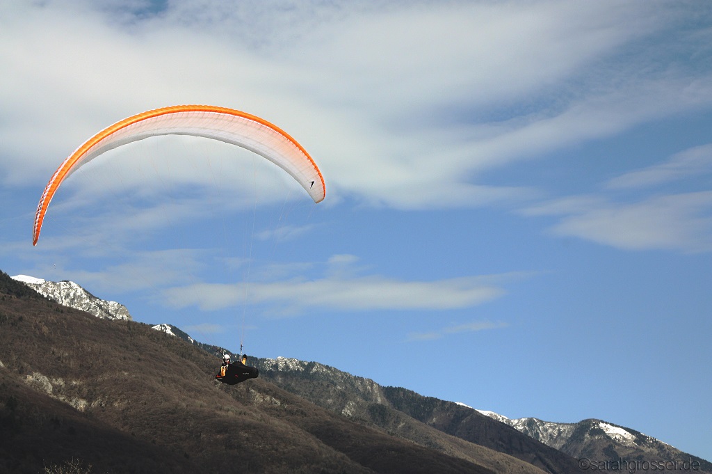 Es bildeten sich zwei Gruppen. Eine flog raus in Talmitte, denn hier schien die Sonne und ließ zwei schöne Wölkchen zu. Die schönen Felsen lagen im Schatten,