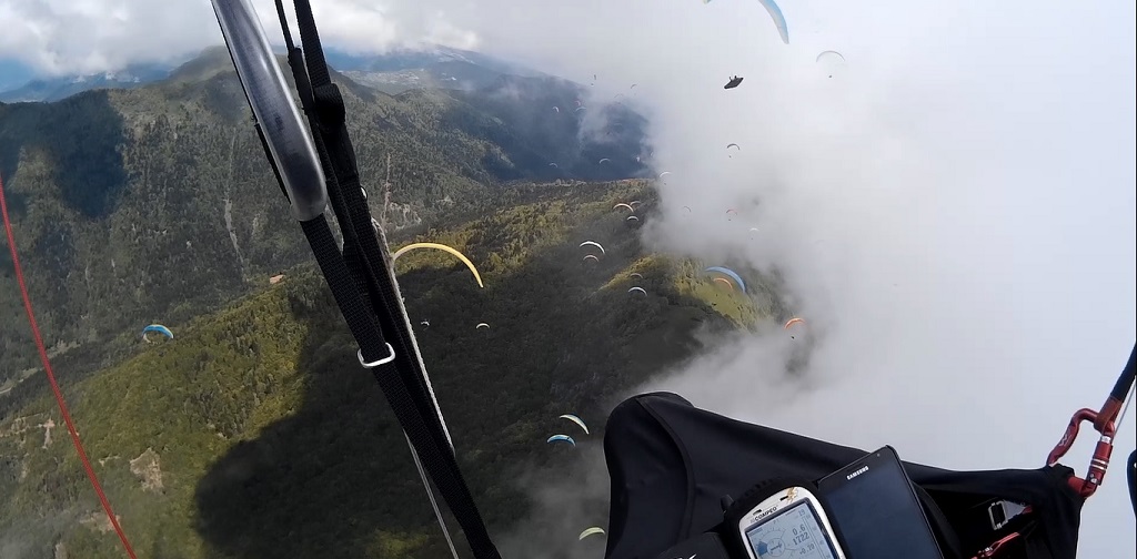 Die Basis bei 3000m ging es mit den 130 Piloten im Startbart los. Ob tief oder hoch, das war egal. Immer wieder blubte es und das Feld wurde neu gemischt. Von letzter Position auf die erste Position, war man schnell durchgewechselt. Der Führungspulk heute zögerlich und so flogen fast immer alle bei sammen.