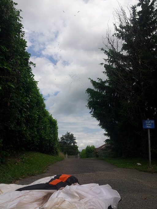 Hohe Bäume und Stromleitungen, ließen die Gärten extrem Schrumpfen und so reichte es nach einer 180° Kurve nur noch für einen kleinen Weg. Der Schirm blieb leicht im Baum hängen und mit viel Speed ging es auf die Straße.